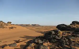 Al norte de Sudán, entre Jartum y la frontera egipcia, se extiende un desierto de arena que pertenece al Sahara y es atravesado de sur a norte por el río Nilo, que lo divide en dos: al este, el desierto de Nubia, y al oeste, el desierto de Libia. Son muy similares, con rocas y dunas, pero solo hay oasis en el de Libia, como Bir en Natrūn,[1] aunque no es suficiente para mantener una población. En esta región, solo es habitable un área de en torno a 2 km de anchura junto al río Nilo.