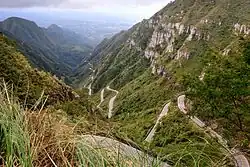 A partir de entonces, la región costera más recta presenta lagunas costeras, como las de Esteves, Caverá, Sombrio y, por último, el conocido Morro dos Conventos. Es una estructura de rocas sedimentarias viejas, con bloques separados cerca del océano, con un escarpe difícil de subir. Y, en la frontera con Rio Grande do Sul, la costa tiene un segundo acantilado de bloques separados, pero Serra Geral: Torres. Sin embargo, allí comienza una segunda tierra, la tierra gaúcha.[1]