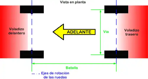 Se definen como voladizos todas las zonas del vehículo que rebasan el espacio delimitado por los ejes delantero y posterior del vehículo. A menudo es mayor el voladizo posterior que el delantero, en particular en el caso de los camiones.