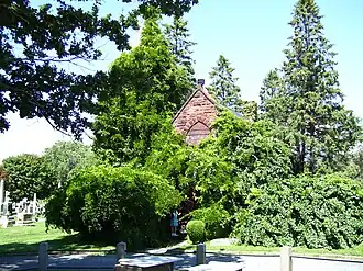 - Capilla conmemorativa de Belmont, cementerio de la isla, Newport, Rhode Island (1886-1888): descuidado, vacante y deteriorado.