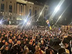 La crisis se profundizó después de que el Parlamento Europeo aprobara una resolución que exige la celebración de nuevas elecciones en Georgia «bajo vigilancia internacional».[61] Como consecuencia, el primer ministro, Irakli Kobajidze, anunció la suspensión unilateral de las negociaciones para la adhesión a la UE hasta finales de 2028.[62] El anuncio hecho por Kobajidze fue considerado ampliamente inconstitucional y doscientos empleados del Banco Nacional de Georgia declararon que la suspensión era incompatible con el artículo 78 de la Constitución y dimitieron de sus puestos de trabajo.[63] El anunció provocó una fuerte escalada de las protestas que originaron en disturbios que fueron reprimidos por la policía antidisturbios.[48][50]