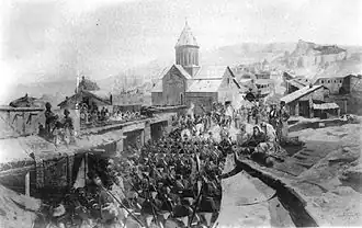 En 1783, Heraclio II firmó el Tratado de Gueórguiyevsk con Catalina, según el cual Kartli-Kajetia acordó renunciar a la lealtad a cualquier estado, excepto Rusia, a cambio de la protección rusa.[12] Pero cuando estalló otra guerra ruso-turca en 1787, los rusos retiraron sus tropas de la región para usarlas en otro lugar, dejando el reino de Heraclio desprotegido. En 1795, el nuevo shah persa, Agha Mohammed Khan, lanzó un ultimátum a Heraclio, ordenándole que rompiera relaciones con Rusia o enfrentara una invasión.[13] Heraclio lo ignoró, contando con la ayuda rusa, que no llegó. Agha Mohammad Khan llevó a cabo su amenaza y capturó y quemó la capital, Tiflis, reduciéndola a cenizas, mientras intentaba restablecer la tradicional soberanía de Persia sobre la región.[14][15]