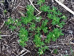 Es una planta herbácea anual o bienal que crece con tallos peludos hasta aproximadamente 50 cm de largo. Pueden ser erectos o se encuentran cerca del suelo. Cada hoja es de varios centímetros de largo y de ancho y está dividida en varios lóbulos, cada uno de los cuales pueden tener más pequeños lóbulos o dientes. Las flores crecen solas o en parejas y tienen sépalos y pétalos pequeños de color lavanda, cada uno con una muesca en la punta. El fruto tiene un cuerpo redondeado con un largo estilo recto de unos 2 centímetros de longitud y con una punta de pico pequeña.
