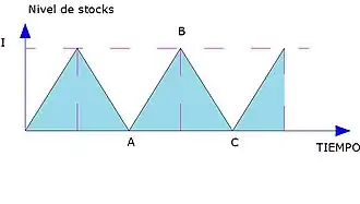 Desde este punto, el nivel de existencias decrece, como consecuencia de una demanda uniforme y constante, cuando las existencias se agotan el ciclo se inicia de nuevo.