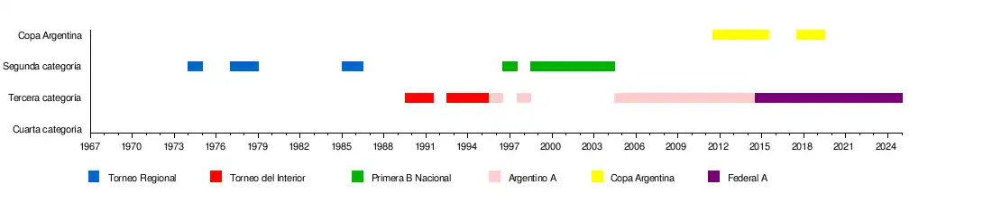 | 2014 | Federal A | 40 | 7.º[36] | 15 | 14 | 3 | 6 | 5 | 20 | 19 | 1 | Copa Argentina | Fase preliminar regional | — | |