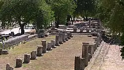- ↑ a b Stillwell, Richard; MacDonald, William L (1976). «Olympia, Greece». En McAllister, Marian Holland, ed. The Princeton Encyclopedia of Classical Sites (en inglés) (Princeton, N. J: Princeton University Press). Consultado el 29 de octubre de 2024.