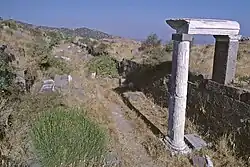 En la parte oriental de la zona central había un pequeño templo de estilo corintio dedicado a Heracles. En el lado norte de la zona central, en el nivel superior, había una estoa de dos pisos de estilo dórico. En el lado sur de la explanada había una pequeña terraza inferior.[1]