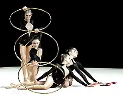 La gimnasia rítmica es una modalidad de la gimnasia y una disciplina deportiva practicada principalmente por mujeres, aunque actualmente también es practicada por hombres, esta disciplina combina elementos de ballet, gimnasia y danza, así como el uso de diversos aparatos como la cuerda, el aro, la pelota, las mazas y la cinta.[1] Los ejercicios se realizan sobre un tapiz con música.