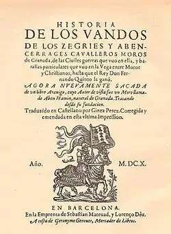 El título completo de su libro es: Historia de los bandos de los zegríes y abencerrajes, caballeros moros de Granada, de las civiles guerras que hubo en ella... hasta que el rey don Fernando quinto la ganó.