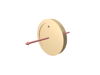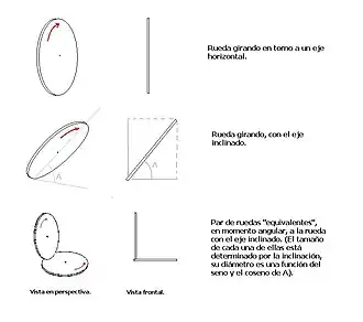 Esto se ve aún más claro si sustituímos el disco del giroscopio, una vez inclinado, por otros dos cuyos ejes de giro son ortogonales, como en las viñetas de la imagen de abajo. El disco vertical representa el momento angular que se conserva en el plano de giro inicial, y el horizontal el que ha pasado a este plano. Si el giroscopio permanece vertical, no hay rueda horizontal, solo equivale a un disco vertical de su mismo tamaño. Cuando comienza a inclinarse, aparece el disco horizontal, al principio muy pequeño, en comparación con el vertical. A medida que el giroscopio se va inclinando, y decrece el ángulo, el tamaño de la rueda vertical disminuiría, y aumentaría el de la horizontal. Es evidente que si las dos ruedas están acopladas en un único mecanismo, este experimentará un momento angular en el plano horizontal, contrario al sentido de giro del disco horizontal a medida que este crezca en tamaño (y por tanto en momento angular) para mantener la conservación del momento angular del mecanismo total.
