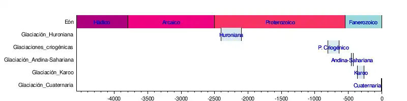La edad de hielo Andina-Sahariana, de menor importancia, fue precedida por las edades de hielo criogénicas (720-630 Ma, las glaciaciones esturtiana y marinoana), a menudo denominadas como «Tierra bola de nieve», y seguida por la edad de hielo del Karoo (350-260 Ma).[3]