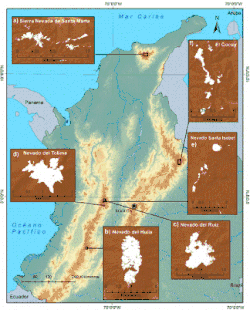 | Sierra Nevada de Santa Marta (Chundua) | Departamento de Magdalena, Cesar y La Guajira | 6,7 | ≈5 500 | Glaciares más cercanos al mar Caribe; reducción significativa en los últimos 30 años. |