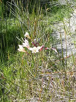 Es una hierba que crece desde un cormo y alcanza un tamaño de 30 a 60 centímetros de altura. Tiene hojas basales en forma de espada con venas prominentes. Cada inflorescencia tiene dos o tres flores con brácteas en forma de lanza. Las flores en forma de embudo son de color blanco o crema, a veces teñida de rosa. El fruto a menudo no se desarrolla. Esta planta es originaria de Sudáfrica, pero se ha convertido en invasoras en otras partes y naturalizado en muchos lugares, especialmente en Australia.