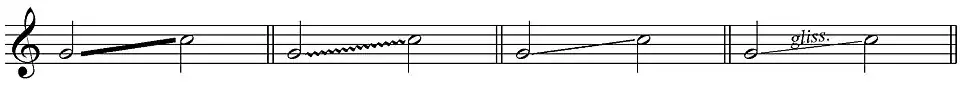 Este adorno musical se representa en las partituras y partichelas mediante una línea oblicua que va desde la nota de partida en la dirección deseada hasta la nota final. La línea puede ser ondulada o recta, más o menos ancha y a menudo va acompañada por la abreviatura «gliss.» (ver Figura 2).[5] La técnica interpretativa variará en función del instrumento musical que deba ejecutar el glissando. En la notación para voz al principio se utilizó una ligadura no muy diferente de la ligadura de expresión, aunque limitada a unir dos notas adyacentes de diferente altura.[6]