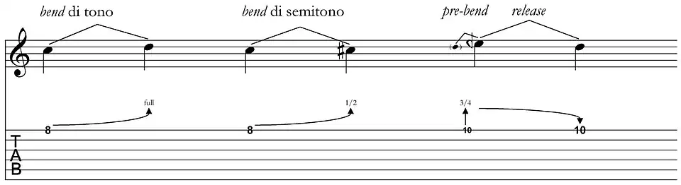 El bend puede alcanzar la distancia de un tono, que en las tablaturas se representa mediante el término full, o bien distancias, diversas, medidas en la tablatura a través de fracciones del tono (por ejemplo, 1/2 para el semitono y así sucesivamente). El release en lugar del efecto de glissando obtenido previamente por la liberación de la cuerda tira. Finalmente, el pre-bend es el tirando de la cuerda sin ascendente glissando; normalmente el pre-bend sigue al release.