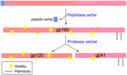 - Acilación de residuos de cisteína (Cys) con grupos palmitoílos, en la región correspondiente a la gp 41, que aumentan la estabilidad de su anclaje a las membranas lipídicas.[1]