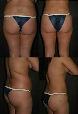 La cirugía de glúteos y lipoescultura del cuerpo humano presenta posibles complicaciones médicas tales como: las psicológicas - insatisfechas las expectativas de imagen corporal de mejora estética; la física - contorno irregular, local y general; el fisiológica - reacciones tóxicas a la anestesia y los medicamentos tumescente; y los nerviosos - parestesia, áreas localizadas de perdurable entumecimiento en la parte corregida (s) de la región glútea.[4] Las posibles complicaciones médicas a un procedimiento de aumento de glúteos quirúrgico, el emplazamiento submuscular de un implante glúteo, incluyen la infección, dehiscencia de la herida quirúrgica que expone el implante, la cirugía de revisión, la rotura del implante, seroma (un bolsillo de líquido seroso claro), contractura capsular, la asimetría de la zona corregida, cambiado del implante, cirugía de exceso de corrección, lesión en el nervio ciático, y parestesia (hormigueo de la piel). Las posibles complicaciones médicas a un aumento de las nalgas y/o lipoescultura incluyen la resorción corporal de la parte de la grasa inyectada, contorno asimétrico de la zona del cuerpo corregido, un contorno irregular al cuerpo, seroma, absceso (pus rodeada por tejido inflamado), celulitis (subcutánea inflamación del tejido conectivo), y parestesia.[4]