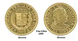 Ante la depreciación debido a la sobreproducción de la plata, en 1897 se emprendieron una serie de políticas monetarias para adoptar el patrón de oro.[20] Se pretendía cambiar la unidad monetaria vigente entonces, el Sol de Plata, por una nueva de oro. Este proyecto tuvo fuertes resistencias, sobre todo entre los exportadores, quienes tenían mayores ganancias cuando el sol valía menos. Finalmente, por ley del 29 de diciembre de 1897, el gobierno ordenó la acuñación de monedas en oro, con el mismo peso y ley que la libra esterlina inglesa. Un decreto del 10 de enero de 1898 estableció el peso y ley de la nueva moneda nacional, la que se llamaría Libra Peruana y tendría en el anverso un escudo del Perú y por el reverso la efigie de un Inca. Durante el siguiente gobierno de Eduardo López de la Romaña, por ley de 14 de diciembre de 1901, se legalizó esta situación.[35]