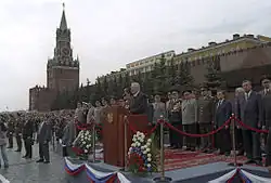 En los últimos años, Gorbachov debió afrontar otros problemas: explosión de violencia entre azerbaiyanos y armenios en 1988 a causa del enclave Nagorno-Karabaj, escasez generalizada en productos básicos y retorno a las cartillas de racionamiento[21] o la huelga minera en 1989[23]. Para John Swift, profesor en el St Martin's College, dos problemas irresolubles impidieron a Gorbachov tener éxito en sus reformas: La crisis económica y la cuestión de las nacionalidades. La división en el seno del PCUS entre conservadores y reformadores debilitó todavía más la posición del secretario general y aumentó el desprestigio de la clase política entre la población. En 1990, Estonia, Letonia y Lituania declararon la independencia unilateral (véase Desfile de Soberanías). En marzo de 1991, se produjo un referéndum en 9 de las 15 repúblicas soviéticas arrojando un resultado de un 78 % a favor de mantener la URSS[21]. En la RSS de Ucrania, república de suma importancia para la URSS por cuestiones culturales e históricas[24], el porcentaje de apoyo a la unión llegó al 70,2 % sobre una participación del 83,5 % y con un apoyo mayor en la zona más oriental[25]. Después de la RSFS de Rusia, la RSS de Ucrania era la república más importante y poblada de la URSS, destacando su agricultura y minería y metalurgia pesada de la cuenca del Donéts[24]. Tras el fallido golpe de Estado de los conservadores que deseaban revertir la situación aprovechando que Gorbachov estaba de vacaciones[21], en agosto de 1991, Borís Yeltsin tomó el control de la RSFS de Rusia iniciando la disolución de la URSS[26]. En el año 2015, Putin declaró que, en su opinión, Gorbachov comprendía la necesidad de emprender reformas, pero nunca llegó a saber con claridad qué reformas eran esas y cómo llevarlas a cabo[27]. Añadió además que ese deseo de reforma del sistema no nace con Gorbachov, sino que está inspirado en las ideas de los socialistas utópicos franceses[28].