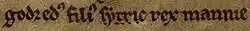 Detalle del texto del folio 32v de la Crónicas de Mann: Godredus filius Sytric rex Manniæ.[1] | ||