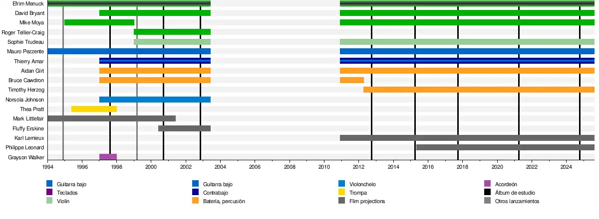 El grupo se formó durante 1994 con sólo tres miembros, pero su formación ha variado frecuentemente, llegando a incorporar hasta quince miembros.[2] Hacia fines de 1998 la banda se estabilizó en nueve miembros. Los instrumentos han ido variando según el número de miembros de la formación, pero ha tendido en general a basarse en guitarras y bajos eléctricos junto con una sección de cuerdas y percusión. Otros instrumentos como el cuerno francés o el glockenspiel han aparecido de manera más ocasional. La música de algunos de sus discos es acompañada de fragmentos hablados grabados por la banda a lo largo de toda Norteamérica, incluyendo un predicador callejero en Providence, Rhode Island, un anuncio en una gasolinera, un grupo de niños hablando y cantando en francés, así como también fragmentos grabados directamente de una radio de onda corta.[4]