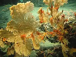- ↑ Stone Robert P; Shotwell S Kalei. (2007). «Estado de los ecosistemas de coral profundo en la región de Alaska: Golfo de Alaska, Mar de Bering y las Islas Aleutianas». En: Lumsden SE et al., eds. El estado de los ecosistemas de corales profundos de los Estados Unidos. Memorando técnico de la NOAA CRCP-3. Silver Spring, MD: 65-108.
