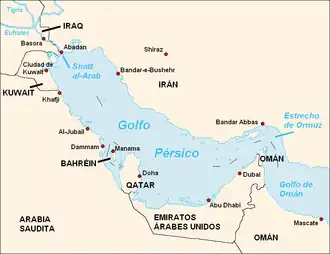 1. «On the Northwest. A line joining Ràs Limah (25°57'N) on the coast of Arabia and Ràs al Kuh (25°48'N) on the coast of Iran (Persia).