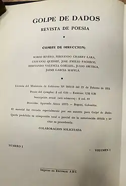El primer número aparece en enero de 1973. Estaba dedicada completamente al género lírico, aun cuando la gran mayoría de los textos publicados eran de autores colombianos, la revista se posicionaba como un gran faro para visibilizar a las nuevas manifestaciones poéticas en Hispanoamérica y Latinoamérica, especialmente. En este primer número aparece el editorial a cargo de Fernando Charry Lara, donde plantea el ethos del grupo que estaba detrás de la revista y que precisamente no se podría observar como un grupo, en palabras de James J. Alstrum de la Universidad de Illinois, en el libro: La generación desencantada de Golpe de Dados: los poetas colombianos de los años 70, publicado por la Universidad Central en el año 2000, dice: