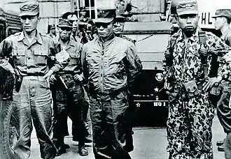 ![]() El mayor general Park Chung-hee (en el frente al centro) y soldados encargados de efectuar el golpe. | ||