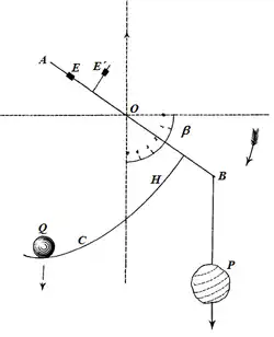La barra AB gira en torno al punto O y sostiene en B el peso P que se quiere medir. Está, rígidamente unida, a un carril CH, por el que rueda el contrapeso Q. Los pequeños contrapesos deslizantes E, E´ del otro extremo de la barra, equilibran el peso del carril, situando el centro de gravedad del conjunto -sin las cargas Q y P- en el punto O. En esta situación, el carril CH actúa como guía y coloca al contrapeso Q, en relación con el dispositivo, en la misma situación en que estaría si colgara del hilo enrollado en torno a la cicloide. La distancia entre el punto O y la línea de acción del peso, es en todo instante la que equilibra al dispositivo en un ángulo β proporcional al peso P. Esta modalidad de goniobarímetro es completamente equivalente a la que ya hemos descrito.