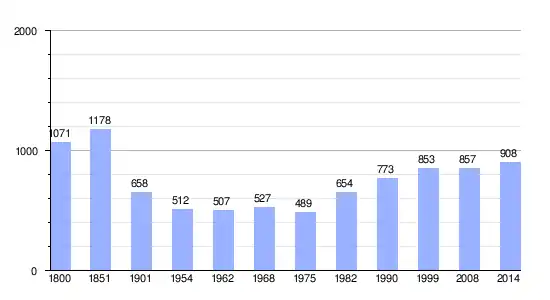 Los datos demográficos contemplados en este gráfico de la comuna de Gonneville[4] se han cogido de 1800 a 1999 de la página francesa EHESS/Cassini, y los demás datos de la página del INSEE.[5]