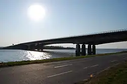 ![]() Vista aérea del Gooimeer (abajo), con Flevoland en el centro. El puente que se ve es el Hollandse Brug | ||