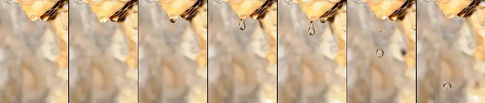 Una gota es un volumen pequeño de algún líquido (agua, por ejemplo), delimitada casi completamente por superficies encadenadas entre sí. La manera más sencilla de formar una gota es permitir que el líquido fluya suavemente hacia el borde de un recipiente. Cuando la gota se exceda de un determinado tamaño, perderá su estabilidad y caerá. Las gotas de agua también se forman por condensación, al enfriar un vapor y por atomización. El peso de la gota más grande que puede colgar del borde de un tubo de radio "a" es (aproximadamente):