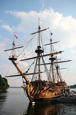 - ↑ La peculiaridad de la estructura de la quilla inventada por Pedro I viene señalada en el libro de S. Yelaguin Historia de la Flota Rusa. Período de Azov, que actualmente sigue siendo una de las fuentes más reconocidas sobre la historia de la construcción naval en los astilleros del almirantazgo de Vorónezh. Los cambios en el calado del buque y otras particularidades aparecen en los libros de A. Byjovski Navíos de Pedro, V. I. Rastorgúyev Patria de la Armada Rusa y otros. Véase asimismo la sección «Descripción»