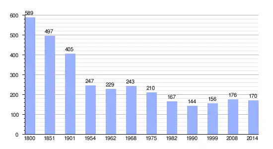 Los datos demográficos contemplados en este gráfico de la comuna de Gourbesville[5] se han cogido de 1800 a 1999 de la página francesa EHESS/Cassini, y los demás datos de la página del INSEE.[6]