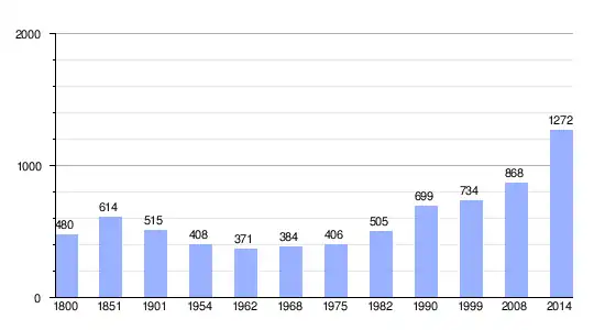 Los datos demográficos contemplados en este gráfico de la comuna de Goussainville[5] se han cogido de 1800 a 1999 de la página francesa EHESS/Cassini, y los demás datos de la página del INSEE.[6]