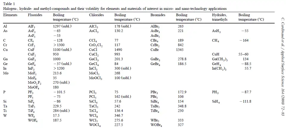 La clave para desarrollar procesos de grabado complejos exitosos es encontrar la química de grabado con gas adecuada que forme productos volátiles con el material a grabar, como se muestra en la Tabla 1.[3] Para algunos materiales difíciles (como los materiales magnéticos), la volatilidad sólo se puede obtener cuando se aumenta la temperatura de la oblea. Los principales factores que influyen en el proceso del plasma: [2] [3] [5]