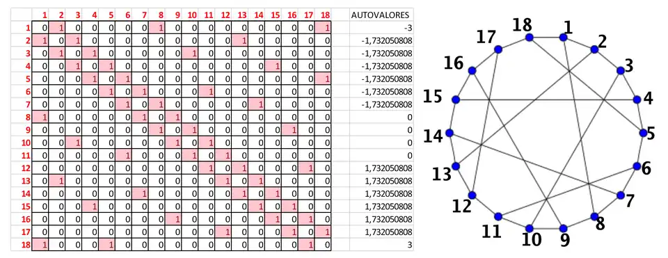 Esto implica que se trata de un grafo 3-regular, formado por 18 vértices. Para comprobar que se trata de un grafo de Ramanujan, es necesario construir su matriz de adyacencia, y analizar sus autovalores. Para ello, se parte de una matriz de 18x18 (inicialmente con todas sus celdas con valor 0), y se van situando valores 1 en las celdas que se correspondan con alguna conexión en el gráfico. Por ejemplo, la fila 4 tiene rellenadas con 1 las columnas 3 y 5 (los dos vértices adyacentes al vértice 4 en el perímetro del polígono) y la columna 15 (correspondiente a la conexión entre los vértices 4 y 15). Una vez completado este proceso de rellenado de filas para los 18 vértices, se obtiene una matriz que dadas las condiciones del polígono, es simétrica, y posee tres celdillas con el número 1 en cada fila y en cada columna.