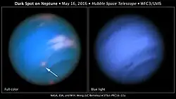 - ↑ «Dark spot on Neptune». ESA/Hubble. 27 de junio de 2016. Consultado el 8 de enero de 2024.
