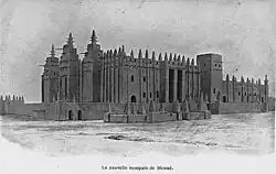 - ↑ Dubois, 1911, p. 187, incluye una imagen de la nueva mezquita tal y como era en 1910;Bedaux, Diaby y Maas, 2003, p. 16, reproduce la imagen de Dubois;Gardi, Maas y Mommersteeg, 1995, p. 162, incluye una fotografía tomada antes de 1914.