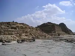Canteras de la meseta de Guiza, con restos de extracción de bloques. Al fondo, la Gran Pirámide.