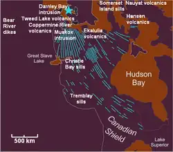 - ↑ Day J.M. 2008. The 1.27 Ga Mackenzie Large Igneous Province and Muskox layered intrusion. Large Igneous Provinces Commission. [1]