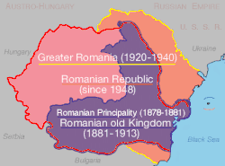 El concepto de "Gran Rumanía" se materializó como una realidad geopolítica después de la Primera Guerra Mundial.[12]​ Rumania ganó el control de Besarabia, Bucovina y Transilvania. Las fronteras establecidas por los tratados que concluyeron la guerra no cambiaron hasta 1940. El estado resultante, a menudo denominado "România Mare" o, alternativamente, en rumano: România Întregită, fue visto como el 'verdadero', todo el estado rumano, o, como dice Tom Gallagher, el "Santo Grial del nacionalismo rumano".[21]​ Su constitución, proclamada en 1923, "ignoró en gran medida las nuevas realidades étnicas y culturales".[22]