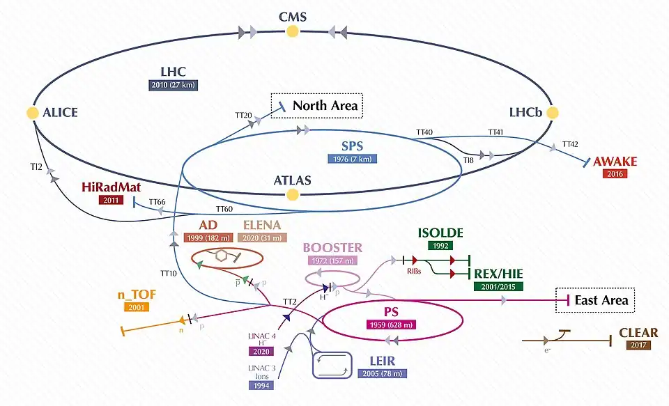 En este último, los protones se aceleran a 1,4 GeV y se inyectan en el Sincrotrón de Protones (PS), donde se aceleran a 26 GeV. Finalmente, el Supersincrotrón de Protones (SPS) se usa para aumentar su energía aún más hasta 450 GeV antes de que finalmente se inyecten (durante un período de varios minutos) en el anillo principal. Aquí los racimos de protones se acumulan y aceleran (durante un período de 20 minutos) a su pico máximo de energía y, finalmente, circulan durante 5 a 24 horas seguidas mientras se producen colisiones en los cuatro puntos de intersección.[39]
