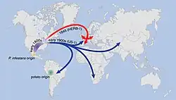 En 1844, los periódicos irlandeses publicaron informes sobre una enfermedad que durante dos años había atacado los cultivos de patata en América.[32] Una fuente probable fue el este de los Estados Unidos, donde en 1843 y 1844 la plaga destruyó en gran medida los cultivos de patata. Barcos de Baltimore, Filadelfia o la ciudad de Nueva York podrían haber traído patatas enfermas a los puertos europeos.[33] W. C. Paddock postuló que fue transportada en patatas para alimentar a los pasajeros en buques mercantes que navegaban de América a Irlanda.[25] Una vez introducido, se extendió rápidamente. A mediados de agosto de 1845, había llegado a gran parte del norte y centro de Europa; Bélgica, los Países Bajos, el norte de Francia y el sur de Inglaterra habían sido afectados.[34]