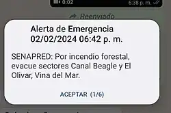 - ↑ «(ACTUALIZACIÓN 22:00 horas) Subtel Informa: 70 mensajes SAE enviados en la zona central del país y 283 antenas fuera de servicio en la Región de Valparaíso por incendios forestales». Subsecretaría de Telecomunicaciones de Chile. 3 de febrero de 2024. Consultado el 4 de febrero de 2024.