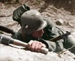 Imagen coloreada de un soldado alemán con una Nebelhandgranate 39, que era una granada de humo en vez de explosiva.