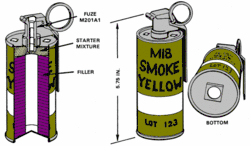 El cuerpo del dispositivo consiste en un cilindro metálico de acero con algunas perforaciones en su parte superior e inferior, esto es para permitir la salida del humo cuando la granada ha sido activada. Contiene de 250 a 350 gramos de compuesto generador de humo (suele ser clorato de potasio) entintado; rojo, verde, naranja, gris, amarillo, azul, blanco, negro o violeta). La reacción producida es exotérmica y el contenedor puede permanecer caliente por algún tiempo, incluso ya sin emitir humo.