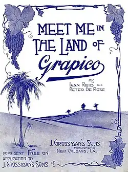 Antes de 1916, J. Grossman's Sons se puso en contacto con los compositores de jazz estadounidenses Peter DeRose e Ivan Reid para que escribieran una canción sobre Grapico.[8]DeRose, que más tarde entraría en el Songwriters Hall of Fame, produjo la canción acompañada de piano, Meet Me in the Land of Grapico.[8]Meet Me in the Land of Grapico es una balada sentimental de Tin Pan Alley que imaginaba una lejana Tierra de Grapico donde el amor vive para siempre.[8]La canción (véase más abajo) y su carátula aludían a un cenador cubierto de parras de uva en el País de Grapico, aunque Grapico no contenía zumo de uva.[8] Dedicando la canción a todos los bebedores de Grapico,[9] J. Grossman's Sons publicó la canción en 1916 y la proporcionó gratuitamente bajo petición.[10]