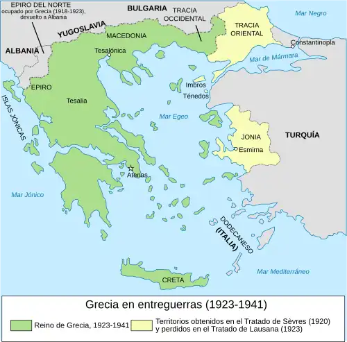 Unas de las primeras labores del Gobierno militar fue negociar la paz con Turquía, que se rubricó finalmente el Lausana el 24 de julio de 1923,[20] y asentar a los refugiados llegados de territorio turco.[26] La derrota militar griega ante Turquía trajo un acuerdo de intercambio de poblaciones entre los dos países (30 de enero de 1923):[20] alrededor de un millón cuatrocientos mil[nota 3] refugiados de territorios turcos pasaron a Grecia[23] y unos trescientos cincuenta mil turcos y búlgaros la abandonaron.[28] Solo exceptuaron a la población turca de Tracia occidental y la griega de Constantinopla.[26][20][nota 4] Esto hizo de Grecia uno de los Estado nación con menor porcentaje de minorías —6 %—[27] y concentró a casi toda la población de habla griega en el país.[31][23] Para Grecia, que entonces contaba con unos cinco millones de habitantes, el asentamiento y la integración de los refugiados supuso un gran problema que tuvieron que tratar los sucesivos Gobiernos.[32] El intercambio eliminó,[23] sin embargo, uno de los pilares de la anterior política exterior griega desde la independencia del país en el siglo XIX, el irredentismo, que desde entonces quedó reducido a la minoría griega en Albania, Chipre y el Dodecaneso, de importancia secundaria.[4][33][29][27] El asentamiento de unos setecientos mil refugiados en Macedonia, región en disputa con Serbia (luego Yugoslavia) y Bulgaria, aseguró la helenización del territorio: si la población de cultura griega había sido aproximadamente un 43 % del total en 1913 frente a un 39 % de musulmanes, en 1926 ya suponía en 89 %.[27] Lo mismo sucedió con la importante y cosmopolita urbe de Tesalónica, que en 1912 contaba con una mayoría de población judía serfardí.[34]